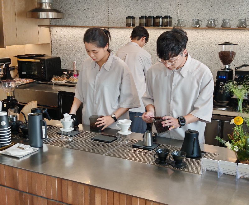 ▲開放式吧台中,咖啡師以手沖方式展現職人精神,讓品飲過程成為一場專注而從容的生活體驗。(圖/磐鈺營建機構提供)